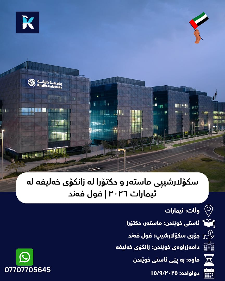 گەر ئارەزوومەندی خوێندنی ماستەر یاخود دکتۆرای لە وڵاتێکی دراوسێ، ئەوا ئەم هەلە ناوازەیە بۆ تۆیە. ئێستا سکۆلارشیپەکانی زانکۆی خەلیفە لە ئیمارات کراوەیە
