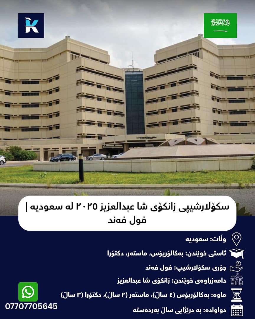 سکۆلارشیپی زانکۆی شا عبدالعزیز سکۆلارشیپی فول فەندن بۆ ئارەزوومەندانی بەکالۆریۆس، ماستەر، دکتۆرا و تایبەتە بە خوێندکارانی نێودەوڵەتی بۆ خوێندن لە سعودیە