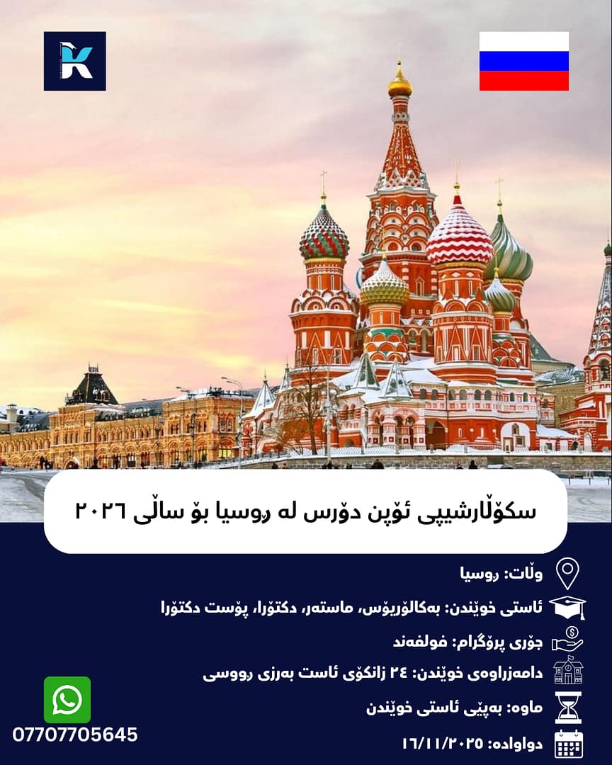 سکۆلەرشیپی ئۆپن دۆرس ٢٠٢٦ لە ڕووسیا پرۆگرامێکە کە لەلایەن حکومەتی ڕووسیا پێشکەش بە خوێندکارانی نێودەوڵەتی دەکرێت بۆ بەدەستهێنانی بڕوانامەی بەکالۆریۆس، ماستەر، دکتۆرا، و پۆست دکتۆرا. ساڵی پێشوو، زیاتر لە ٦٣٠٠ کەس براوەی ئەم سکۆلارشیپە بوون بە هەموو ئاستەکانیەوە. تۆش گەر ئامادەیت و لەخۆتڕادەبینی، دەتوانی یەکێک بی لەو کاندیدانەی کە ئەمساڵ لە سەرانسەری جیهانەوە داواکاری پێشکەش دەکەن. پێویست ناکات هیچ بڕە پارەیەک بۆ پێشکەشکردن بدەی
